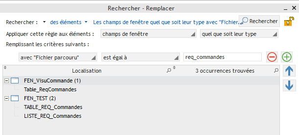 Une demande est régulièrement faite à notre support : comment recherche les champs qui utilisent une certaine requête du projet en source de données ? C'est possible, et facile ! Il suffit dans le volet de recherche (Ctrl+F), d'indiquer une recherche dans "des éléments" à la place de "texte". L'interface propose ensuite tous les choix nécessaires : appliquer cette règle aux éléments "...