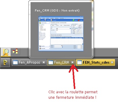 La barre des documents ouverts permet un accès direct à tous les éléments du projet qui sont en cours d'édition. On passe ainsi simplement d'une fenêtre, à un état, au code d'une classe en cours d'édition... Une astuce bien pratique permet d'accélérer la fermeture des éléments qui ne sont plus utilisés. En effet pour refermer un élément, il faut d'abord le réactiver par un clic, puis cliquer sur...