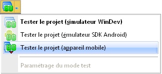 Le test d'une application Android en cours de développement est possible : en mode simulation sous Windows, dans un émulateur du SDK Android, directement sur un téléphone ou une tablette Android : La simulation sous Windows, et l'émulation avec le SDK Android sont toujours possibles, par contre il se peut en fonction du périphérique que le Go direct (appareil mobile) ne doit pas immédiatement opérationnel et provoque le retour "Aucun téléphone Android n'a...