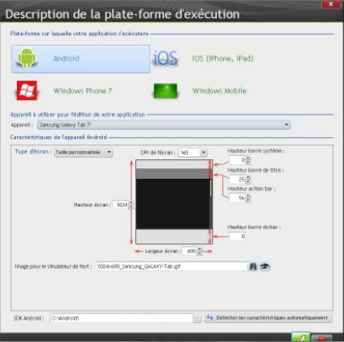 Lorsque l'on est habitué à la création d'IHM pour Windows, Windows Mobile, Android (...), le passage sous iOS surprend lors de la définition de la plate-forme de la configuration de projet. En effet, par "réflexe" on s'attend à retrouver un traditionnel écran de configuration de toutes les caractéristiques d'affichage (largeur, hauteur, densité...). Par exemple pour une configuration de projet destinée à une application Android, la description de la plate-forme...
