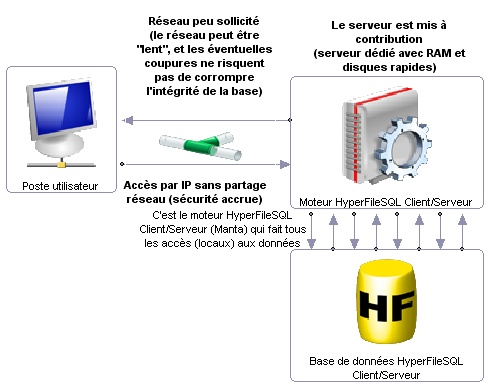 | Lors de l'utilisation de HFSQL Client/Serveur tous les accès aux données sont effectués par le serveur sur lequel le moteur HFSQL Client/Serveur est installé. Les postes clients envoient les ordres au serveur, le serveur les traite localement et renvoie le résultat. Les échanges entre les clients et le serveur sont minimisés, mais la mémoire et les performances du serveur sont fortement sollicitées.