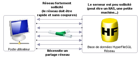 | Lors de l'utilisation de HFSQL classic réseau, c'est la machine de l'utilisateur qui fait tout le travail. Au niveau du serveur seuls le disque et système d'exploitation sont sollicités. Les échanges entre les clients et le serveur sont très nombreux, le réseau est donc fortement mis à contribution. Lors de l'utilisation de HFSQL classic réseau il est donc important de s'assurer sur le réseau est rapide.