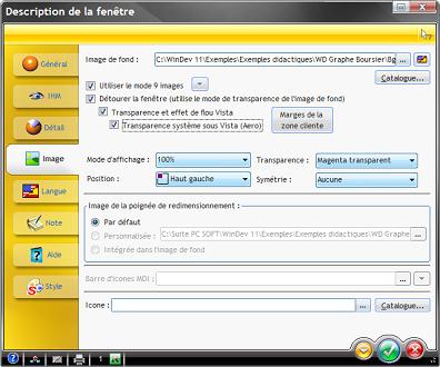 Gabarit Aero : pensez à cocher " Transparence système sous Vista(Aéro) " pour que vos applications utilisent automatiquement le gabarit Vista choisit par l'utilisateur. Cette option est disponible dans la fenêtre à 7 onglets de la description de fenêtre.