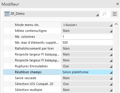 Le framework des applications mobiles possède plusieurs modes de gestion des zones répétées. Il est visible dans la rubrique "Détail" du modifieur, il s'agit du réglage "Réutiliser les champs". Le réglage recommandé est "selon plateforme" : L'utilisation de ce mode "selon plateforme" doit être systématisée, car il est plus sûr et optimisé. Depuis WINDEV Mobile 25 et toutes les...