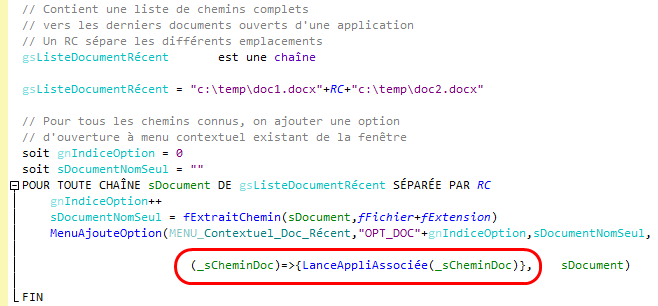 Voici un exemple concret. Historiquement, lorsqu'un traitement avait besoin d'une call-back, on devait nécessairement ajouter une procédure locale à la fenêtre. Prenons pour cette illustration un menu contextuel d'une application qui affiche les précédents documents ouverts :