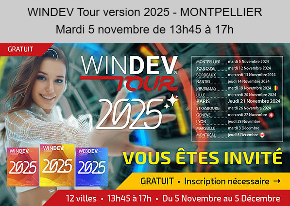 Venez découvrir "en live", sur écran géant, les 925 nouveautés de la version 2025 de WINDEV, WEBDEV et WINDEV Mobile. Inscriptions WINDEV Tour de la version 2025, un séminaire professionnel gratuit. Des ingénieurs PC SOFT expérimentés qui viennent à votre rencontre. 3h de séminaire dans 12 villes en France, Belgique, Suisse et Canada. FRANCE Montpellier, mardi 05 novembre 2024 Toulouse, mardi 12 novembre 2024 Bordeaux, mercredi 13 novembre 2024 Nantes, jeudi 14 novembre 2024 ...